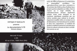 19 mars à 20 heures, 45 rue d'Ulm (Paris 5ème) projection de 9.70, le documentaire de Victoria Solano sur la situation en Colombie suite à la signature du traité de libre échange avec les US. Claire Chanut du Mouvement des Femmes Semencières, animera un partage après la projection. ENTRÉE LIBRE